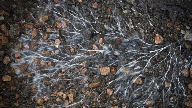 En la siguiente ilustración, nos podemos hacer una idea de lo que es el micelio, y de cómo se extiende por el suelo.