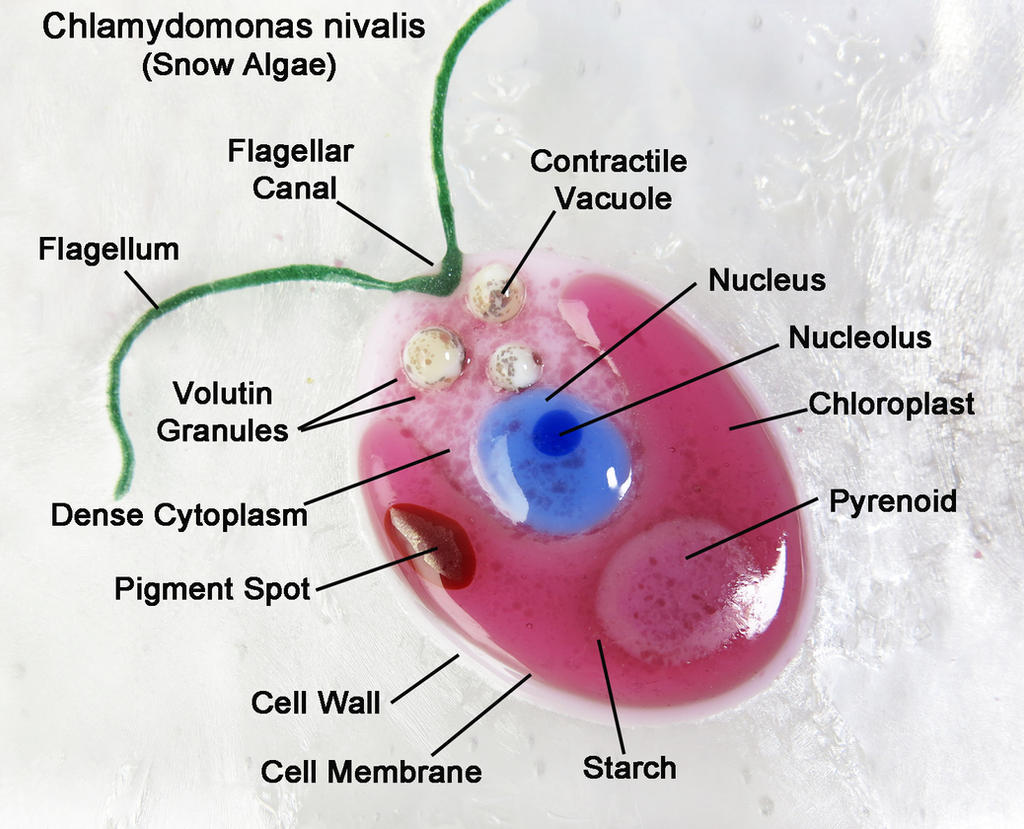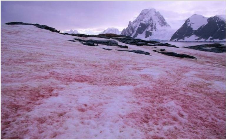 En este apartado, También cabe mencionar el extraño fenómeno que ha intrigado al mundo científico. En los últimos años se ha podido observar cómo en algunas zonas de la Antártida, parte de su hielo se ha ido tiñendo de color rosa. Pues bien, esto es debido a un alga unicelular, chlamydomonas nivalis, la cual prospera a temperaturas cercanas a los 0ºC, y tiene una pigmentación rosa muy características, llegando a teñir la nieve, tal y como podemos ver en las fotografías abajo expuestas. Evidentemente su ciclo de reproducción empieza en verano, y cuando se acerca el invierno forman quistes para sobrevivir el gélido invierno antártico, como curiosidad la temperatura más baja jamás registrada con un instrumento fiable, se dio en la Antártida, concretamente en la base Vostok, en 1983, arrojando un valor de -89.2ºC, pocos organismos pueden sobrevivir a tales temperaturas.